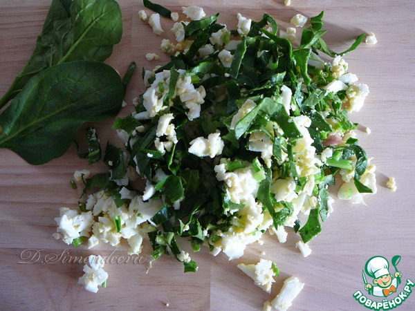 Яйцо очистить и накрошить. Соединить с нарезанными листьями шпината, 1 ч. л. лимонного сока и щепоткой соли и измельчить блендером. Перемешать со сливочным маслом комнатной температуры. *Для себя я сливочное масло не добавляла, так как мне нужен был более диетический вариант, мне вполне хватило масла на смазанных блинчиках и сельди в масле. Я просто нарезала шпинат и смешала его с раскрошенным яйцом