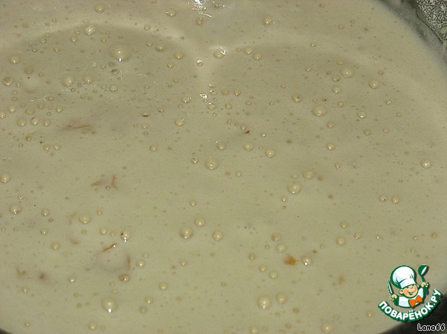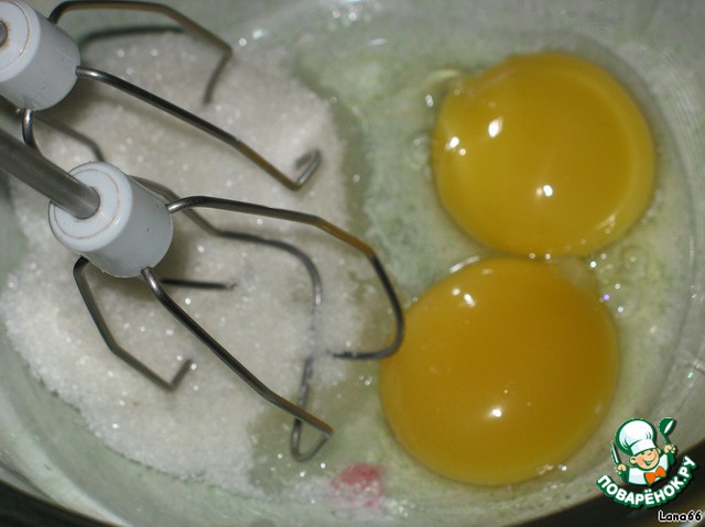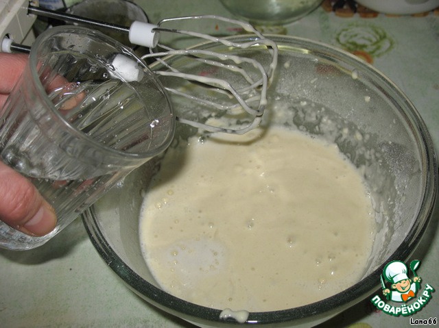 К яйцам добавить 1 стакан газированной воды и часть муки. Хорошо перемешать веничком, чтобы не было комков. Затем снова добавить воды и муки. Старайтесь сильно не мешать тесто, чтобы газы от воды не улетучились.