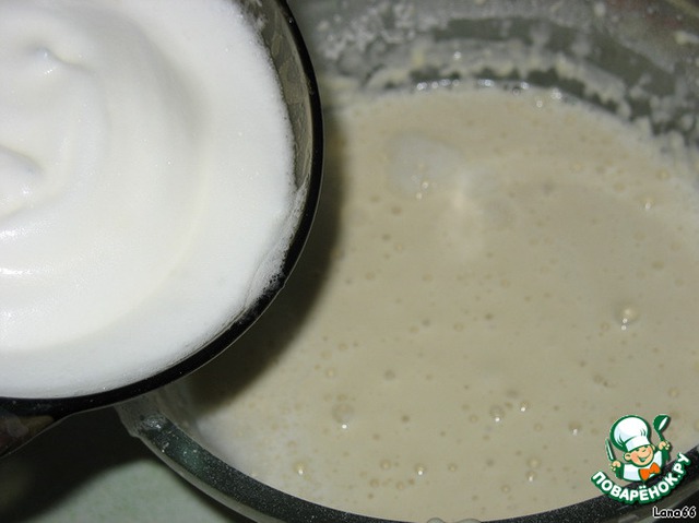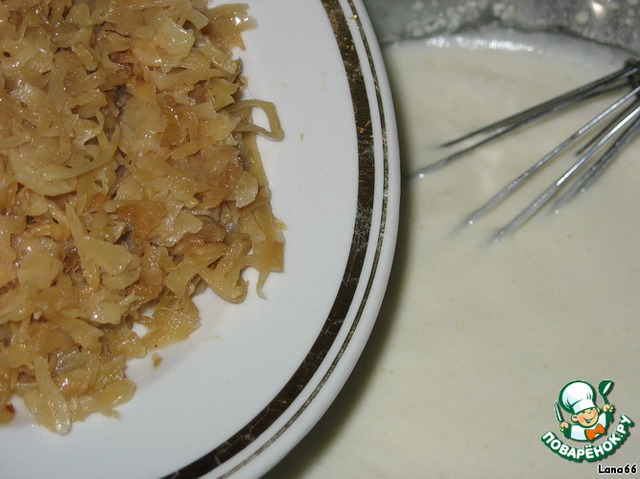 В тесто выложить капусту и аккуратно перемешать, не осаждая белки.