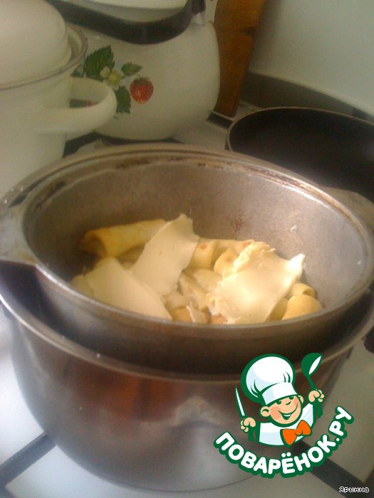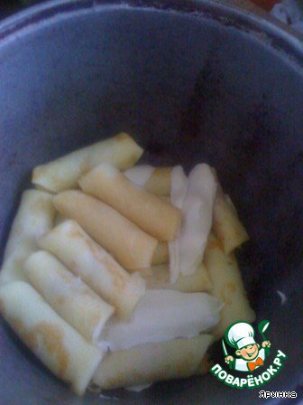 Затем укладываем в казаночек, на дно тоненькие пластиночки масла, затем готовые блинчики и опять несколько тоненьких пластиночек масла, и так каждый слой.