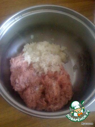 Затем приступаем к фаршу: мясо, лук, чеснок, всё через мясорубку или блендер, соль, перец по вкусу, хорошо вымешать.