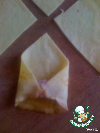 Фарш сформировать в виде пальца и на край кусочка блинчика.