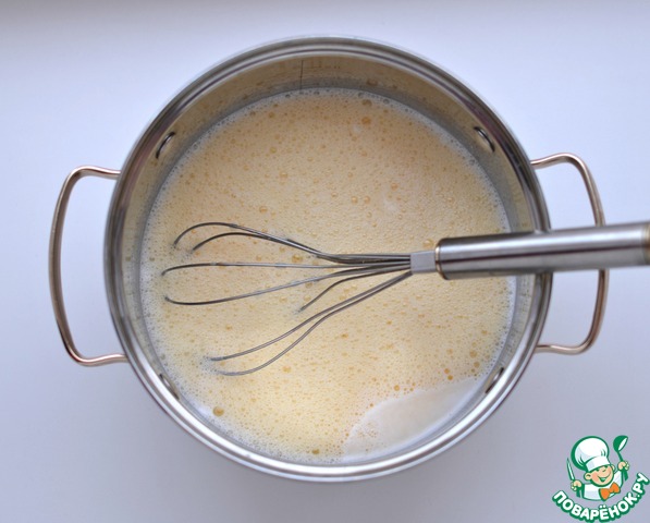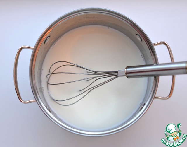 600 мл молока соединить с водой. Слегка подогреть. Добавить соль и сахар. Размешать до полного растворения последних.