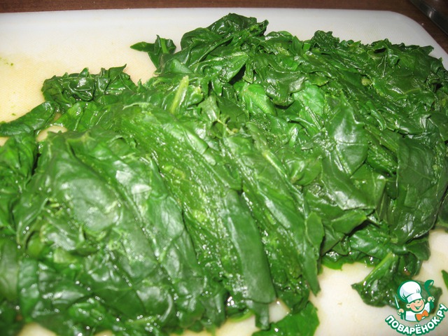 Занимаемся начинкой. Шпинат хорошо промываем, если надо, чистим. Бланшируем около 2 минут. Сливаем воду, даем хорошо стечь жидкости.
