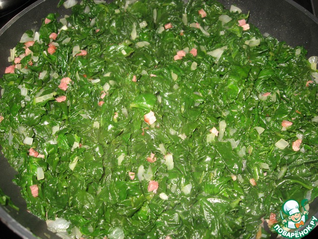 Обжариваем бекон с луком, чесноком, добавляем шпинат и еще немного обжариваем. Солим, перчим, приправляем мускатным орехом.
