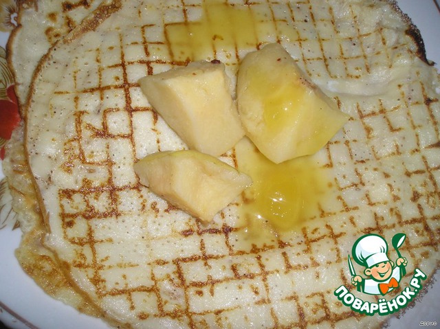 Пропорции теста примерные. Мука добавляется, чтоб и не очень жидко, и чтоб не на оладьи. Сковорода подскажет, что не так: вот они, блины комом - если муки маловато, а если в самый раз - красавцы. Воду добавить обязательно. Как говорила Юлия Высоцкая: "Без воды блины будут резиновыми". Такой блинчик нежнее, тоньше. Заворачивать в него что-нибудь, возможно, сложнее, но вкус - потрясающий! И соль, и сахар - блины можно есть с разными начинками. С красной рыбкой, например. Но сейчас об узелках. Айву порезала на кусочки и довела до готовности в микроволновке. Мощность -800. 10 минут. На блинчик - немножко медку и несколько кусочков айвы.
