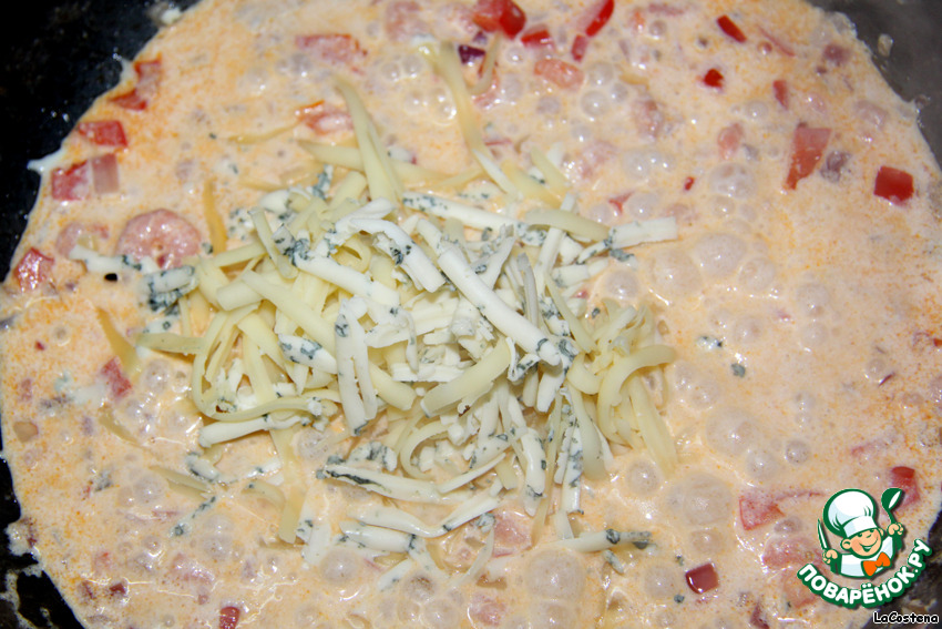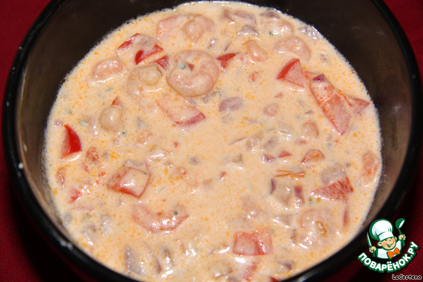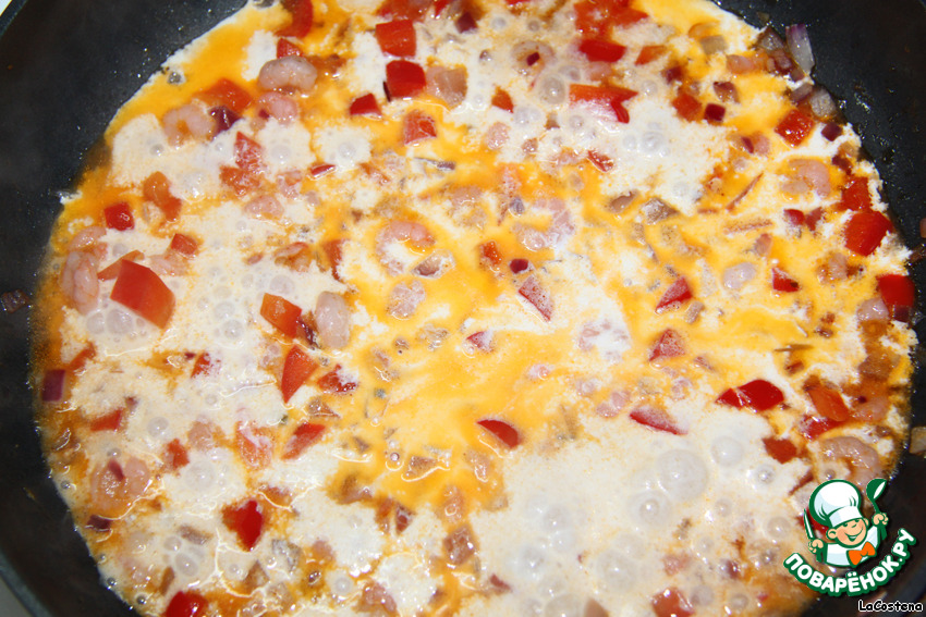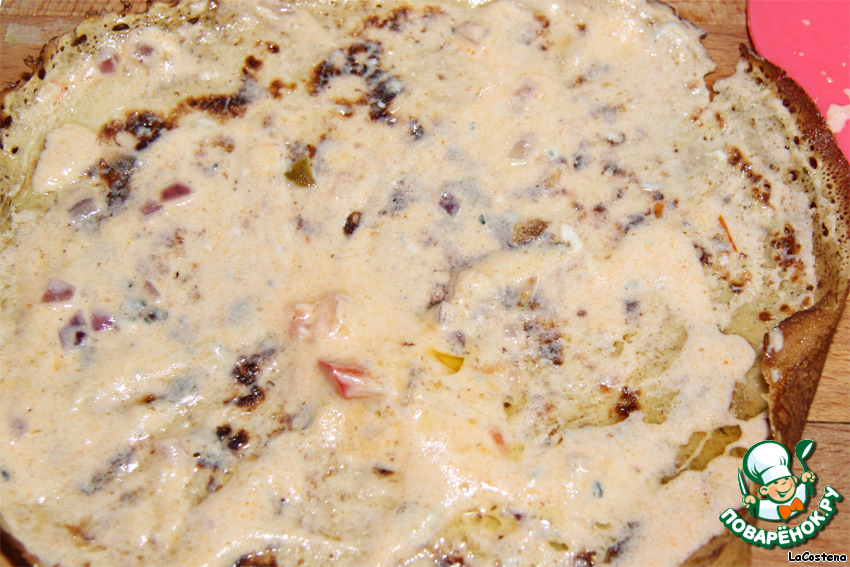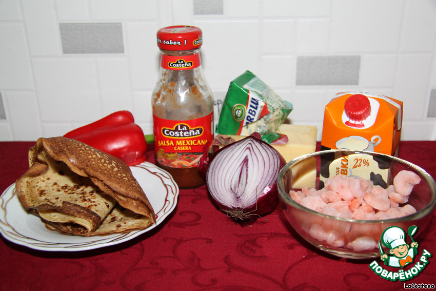 Нам понадобятся: готовые блины, креветки, сыр "Гауда", сыр "Дор-блю", сливки 22%, красный лук, сладкий болгарский перец и острый соус "La Costena Salsa Mexicana".