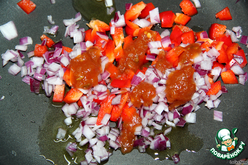 Выкладываем на сковороду лук, перец и заливаем соусом "La Costena".
