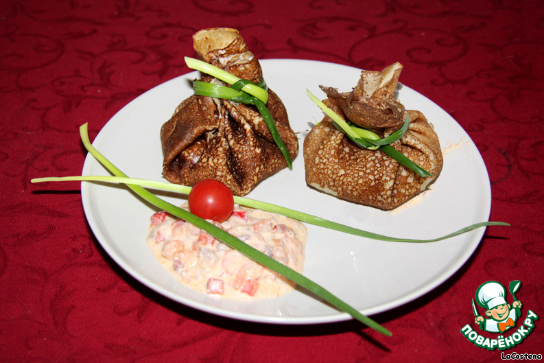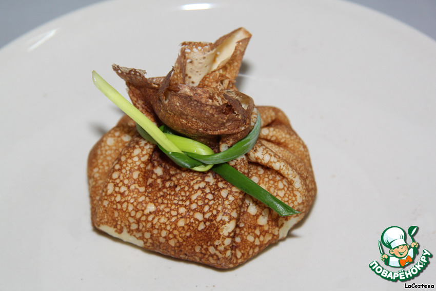 Делаем блинный мешочек, завязываем его зеленым луком.