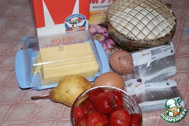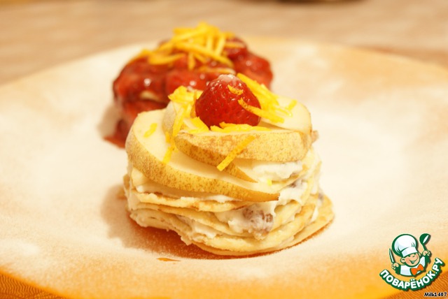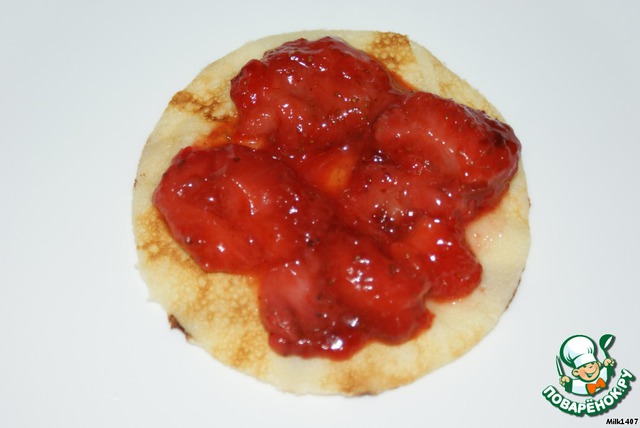 клубнику режем и обжариваем на сливочном масле, присыпав ванильным сахаром и корицей. Клубника должна быть карамельного вида.