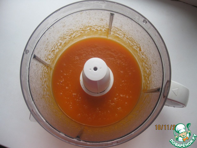 Готовую тыкву вместе с жидкостью, в которой она варилась, отправляем в блендер. Взбиваем до однородности. У кого блендера нет - протираем через сито.