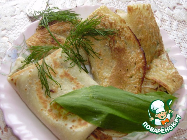 Приготовить блины и выложить на них готовую начинку (к ней еще можно добавить тушеную морковку с лучком)