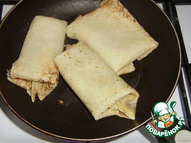 Свернуть блины по схеме, которая вам больше нравится! Выложить на сковороду, хорошенько нагретую и смазанную растительным маслом. Обжарить блинчики с обеих сторон до золотой корочки, чтоб сыр смог расплавиться))