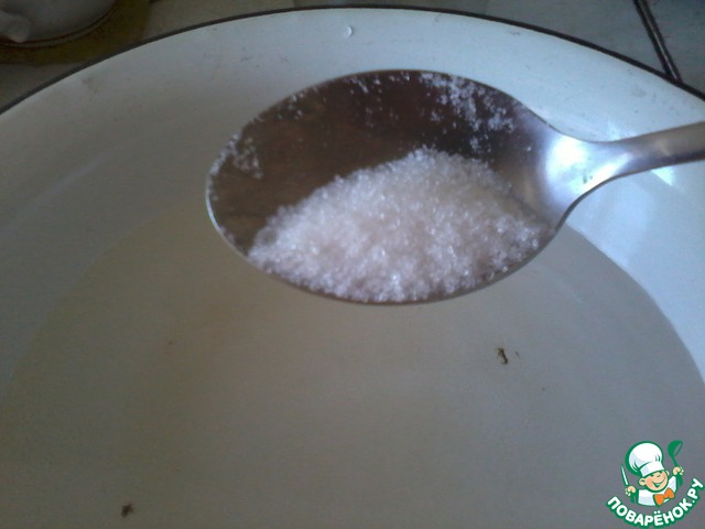 В другую посуду вливаем 2 стакана воды, в которой растворяем 2 столовые ложки сахара, 1 чайную ложку соли.