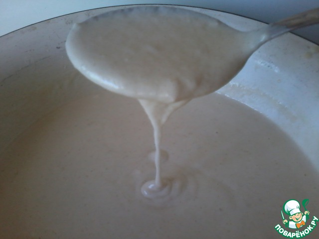 Потом эту воду постепенно вливаем в просеянную муку. Замешиваем водянистое тесто без комочков.