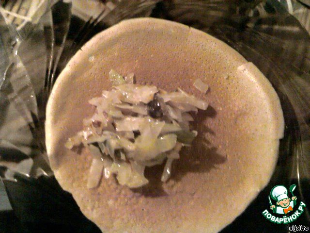 На обжаренную сторону блина кладем начинку и заворачиваем.