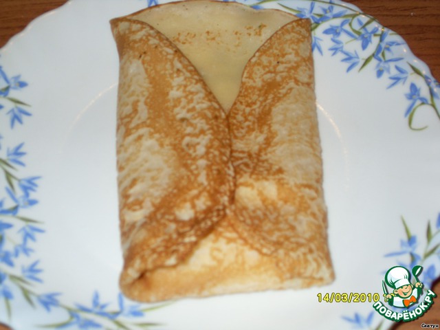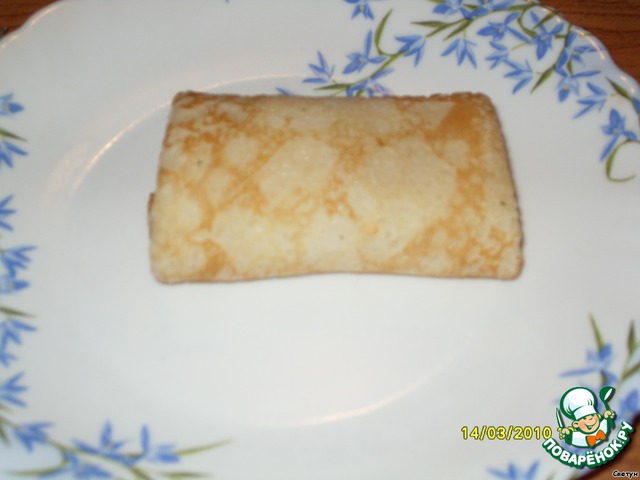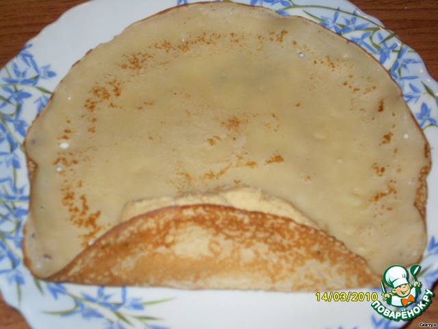 Открыть творожную массу (у меня была с курагой и черносливом). И на блинчик положить 1 чайную ложку массы и завернуть блинчик кулечком, так проделать со всеми блинчиками.
