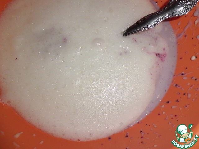Добавляем туда же наше черносмородиновое пюре. Вымешиваем.
