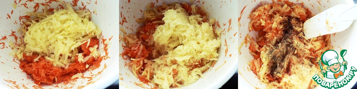 -Картофель очистить и промыть. Три штуки натереть на крупной тёрки, остальные картофелины на мелкой. Добавить специи. Все перемешать.