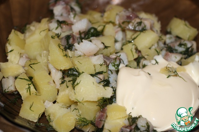 Для первой начинки: сельди мелко нарезать. Картофель отварить в мундире, очистить и мелко нарезать. Смешать вместе сельдь, картофель, заправить сыром. Можно добавить укроп.