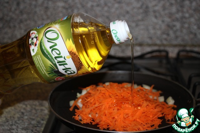 Для второй начинки. Лук мелко нарезать, морковь натереть на средней терке и обжарить до готовности в растительном масле «Олейна с оливковым маслом».