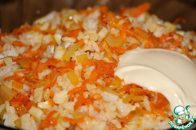 Кальмары отварить в подсоленной воде и мелко нарезать. Рис отварить в подсоленной воде. Соединить кальмары, рис и лук с морковью. Перемешать, по необходимости посолить.