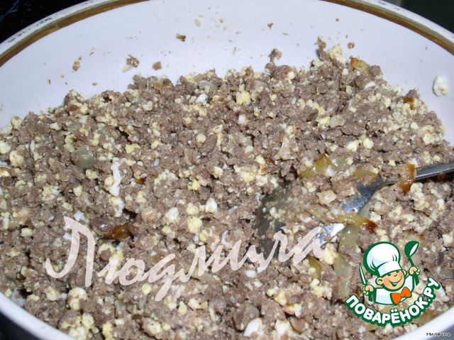 Для фарша: отварить яйца и сердце (я варила его два часа), лук порезать полукольцами. Сердце пропустить через мясорубку. Лук обжарить, добавить фарш и, помешивая, обжарить. Пропустить яйца через мясорубку и добавить к фаршу, периодически помешивая, посолить и добавить майонез, подержать на маленьком огне еще 2-3 мин.