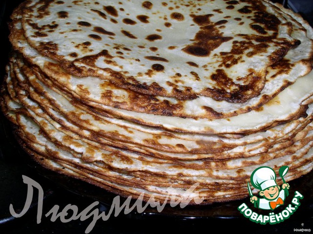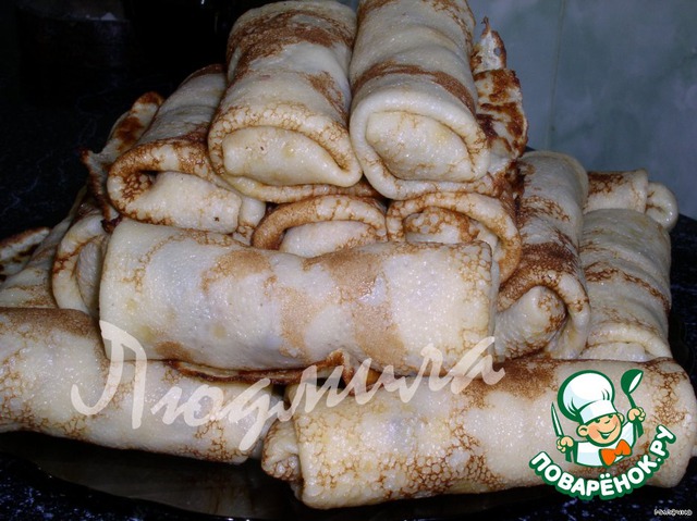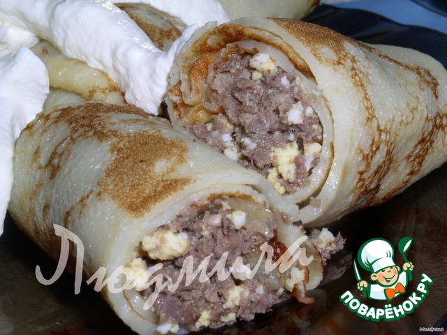 И вот так в разрезе. Можно еще раз обжарить уже готовые блины на сливочном масле.