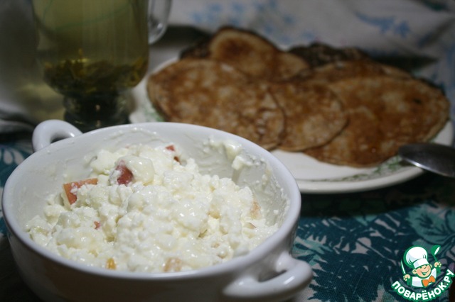 Для творожной начинки нарезаем яблочко маленькими кубиками и смешиваем с творогом и йогуртом так, чтобы получилась однородная масса, затем добавляем 1 чайную ложку мёда и тоже хорошо перемешиваем.