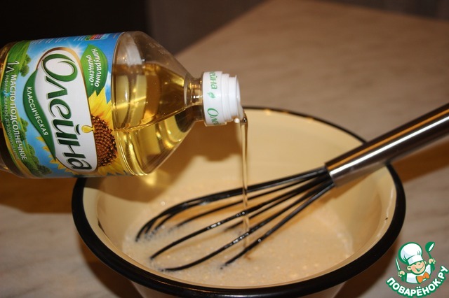 Яйца взбить с сахаром и солью. К яйцам и сахару влить молоко, продолжаем взбивать. Добавить растительное масло «Олейна классическая», продолжаем взбивать.