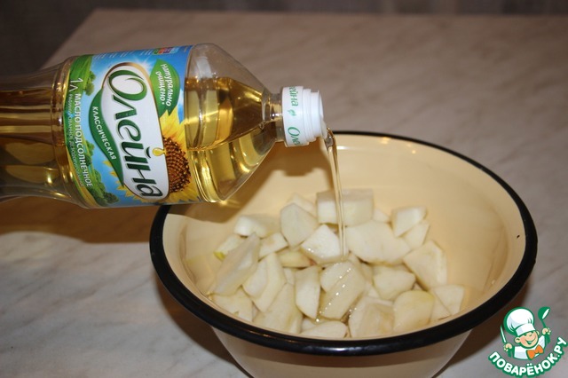 Готовим начинку: три яблока нарезать тонкими дольками (кожуру можно не чистить). В алюминиевую миску или кастрюлю налить растительное масло «Олейна классическая». Высыпать яблоки. Присыпать тремя столовыми ложками сахара и потушить в течении 5-7 мин, чтобы из яблок испарилась влага.