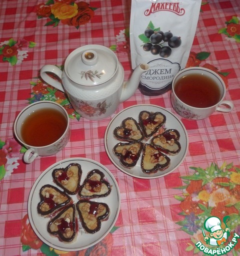 На одно сердечко наносим слой джема из черной смородины и сверху кладем другое сердечко.