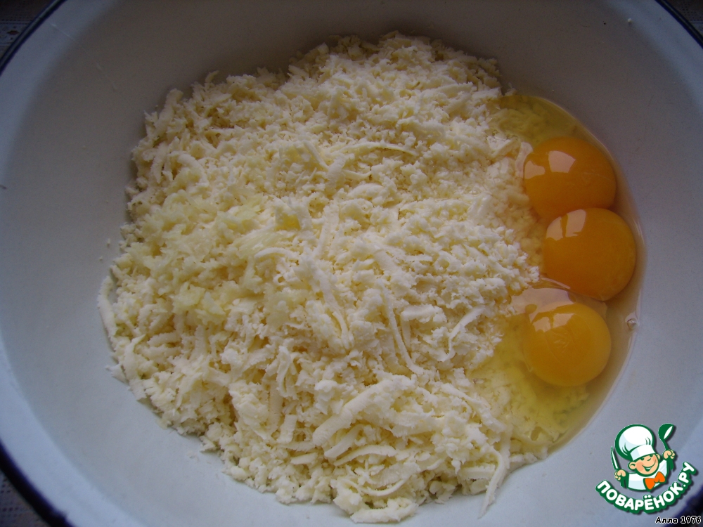 Готовим начинку. Сыр натереть на крупной терке, добавить измельченный чеснок, сырые яйца. Начинки должно получиться примерно столько, сколько и теста.