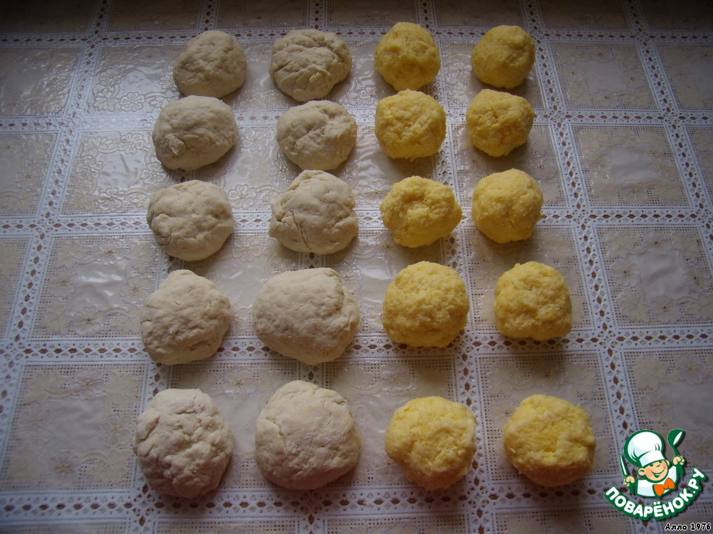 Тесто и начинку разделить на 10 частей (примерно одинакового размера).