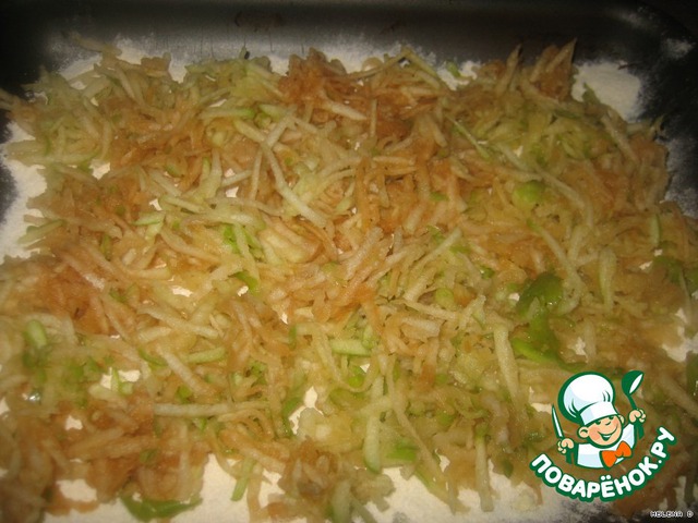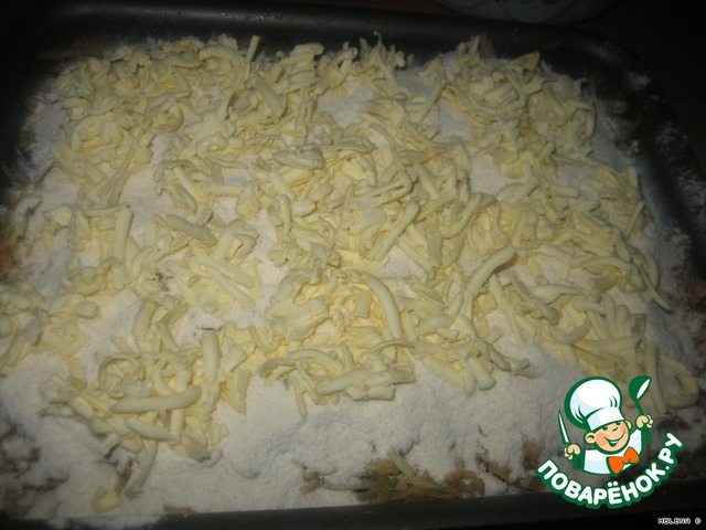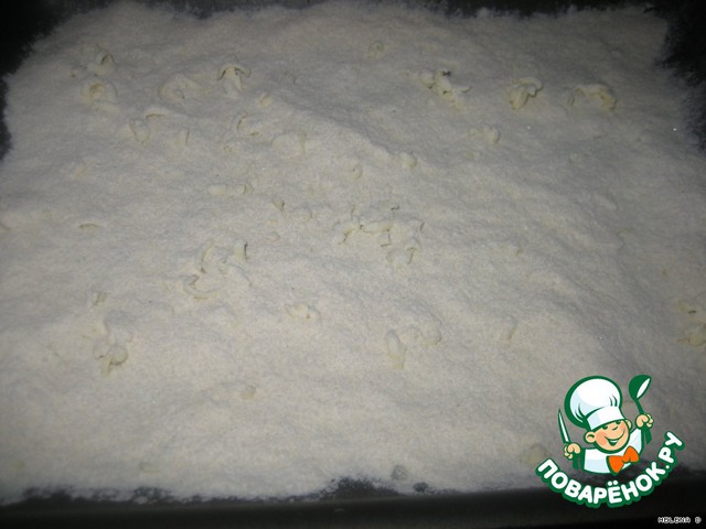 на смазанный противень(у меня 30Х25) распределяем равномерно сначала сухую смесь