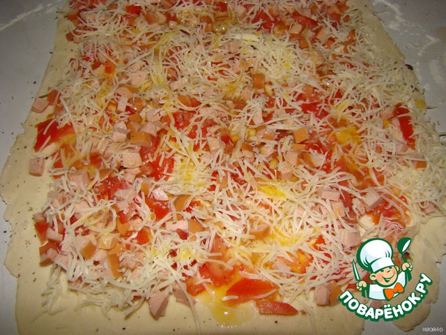 Посыпаем тертым сыром .Яйцо немного взбиваем .солим.Поливаем им нашу пицу