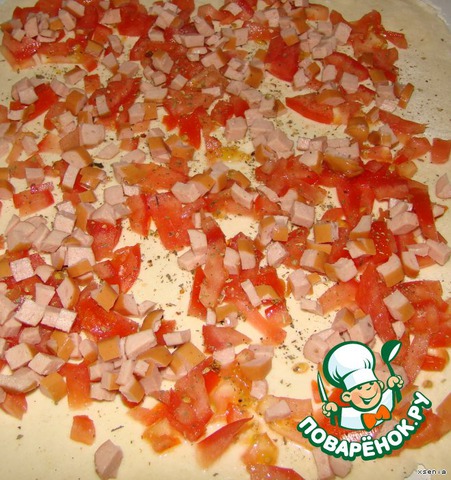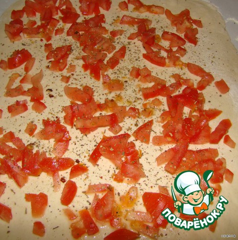 Помидор мелко режем выкладываем на тесто.Посыпаем специями ,солим