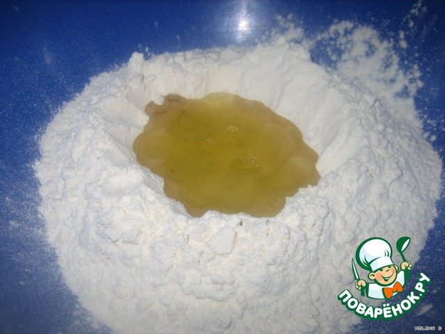 В центре делаем "кратер", в который вливаем 2 ст.л. растительного масла, 1/2 ч.л. соли, 1 сырой яичный белок. Размешиваем и понемногу добавляем примерно 1 стакан некислой простокваши или сыворотки (у меня была сметана 20%)