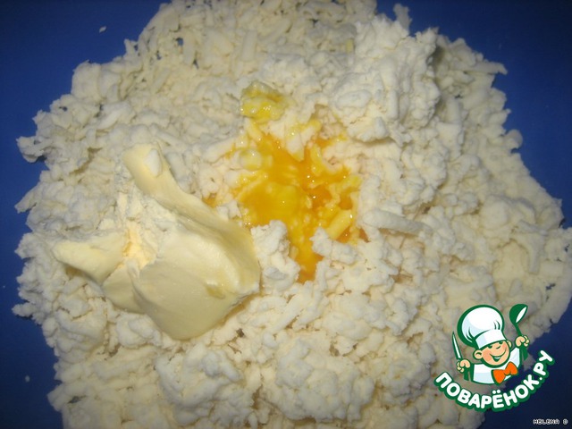 Любой рассольный сыр (брынза, сулугуни, адыгейский) натираем на крупной терке. На каждые 400гр добавляем 1 ст.л. сливочного масла и 1 сырой желток.