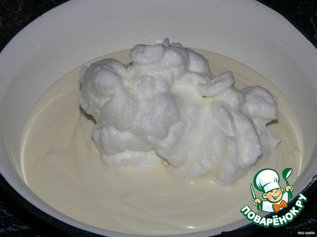 Отдельно взбить в крепкую пену 2 белка и аккуратно смешать их с начинкой.
