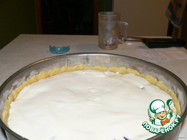 Приготовить начинку. В блендере взбить творог, сметану, сахар, желтки 2 яиц, крахмал.