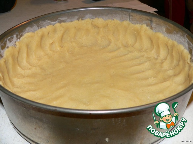 Распределить тесто руками в форме ровным тонким слоем, сделав бортики.