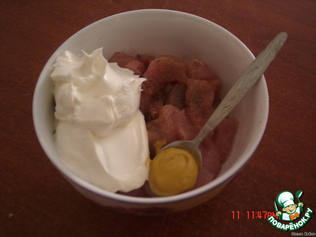 Куриную грудку нарезать кубиками, посолить, добавить специи, горчицу и сметану.
