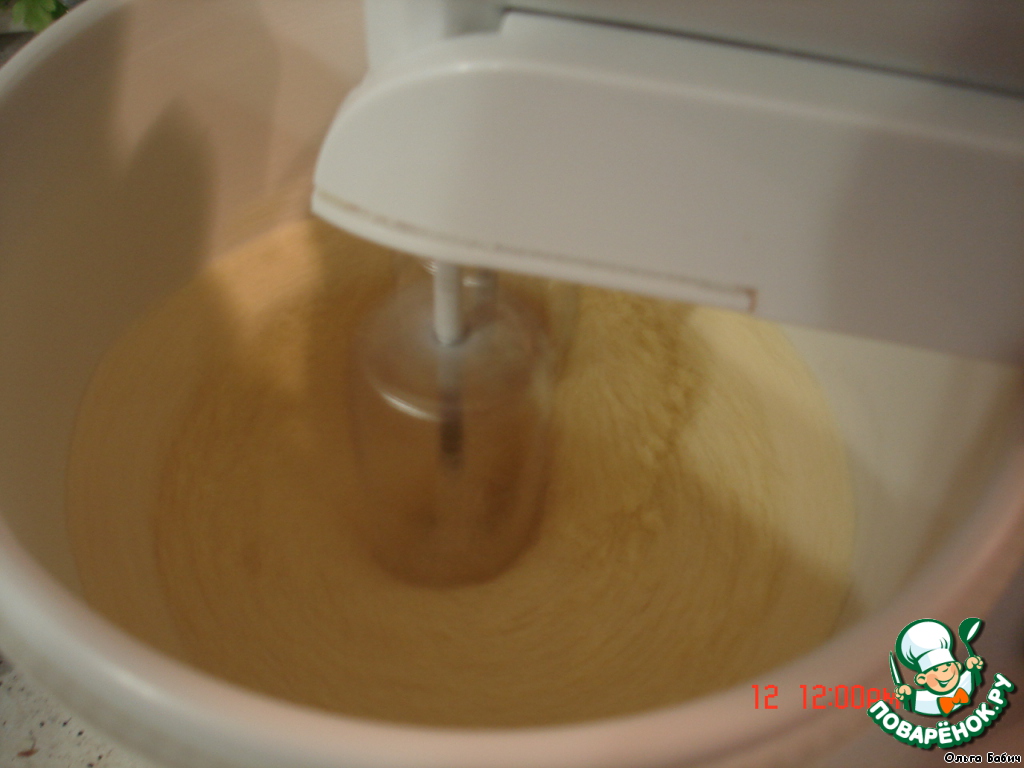 Масло взбить миксером, добавляя муку, соль и разрыхлитель.