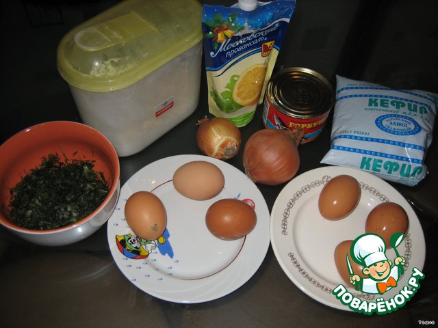 Замешиваем тесто. Для этого соединяем 3 яйца, майонез, кефир и муку. Солить не нужно, так как в майонезе и так достаточно соли.