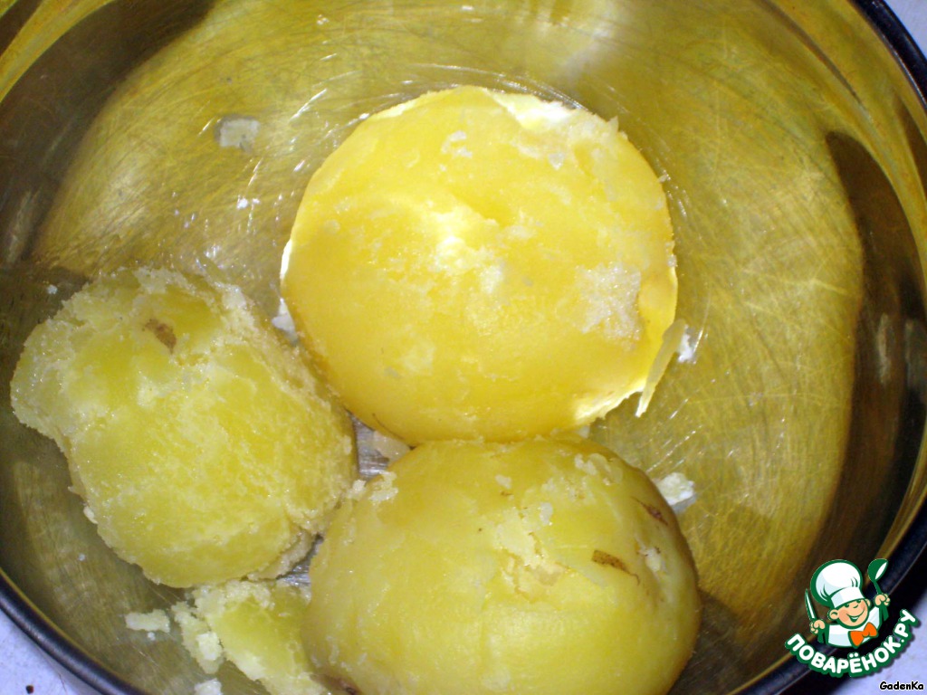 Картофель отварить в мундире, очистить и размять в пюре. Пюре остудить.