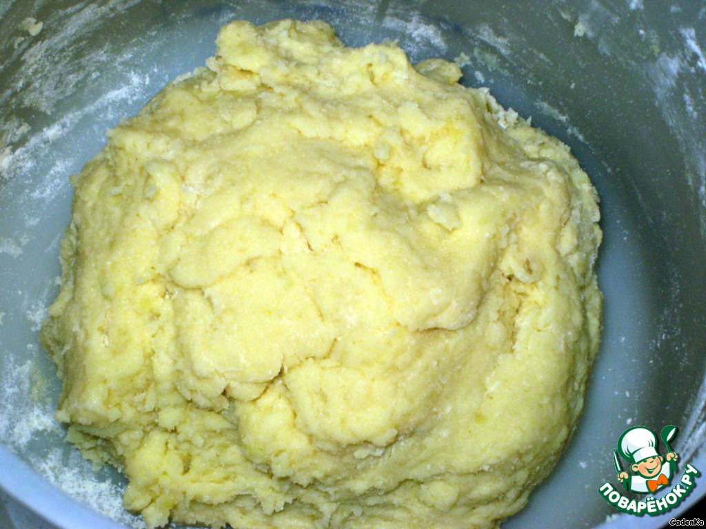 Просеять муку с разрыхлителем. Замесить тесто, не очень крутое, очень мягкое и приятное на ощупь. Можно даже сказать, что просто очень густое картофельное пюре.