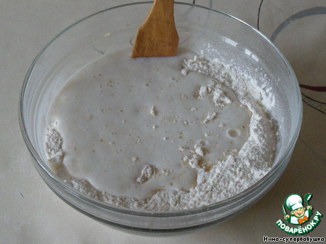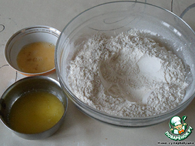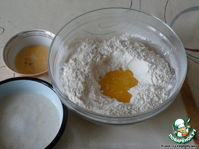 В муке сделать углубление и влить масло, перемешать его с мукой.