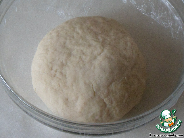 замесить тесто, скатать в шар, положить в глубокую миску, затянуть пленкой и поставить в теплое место для подъема.