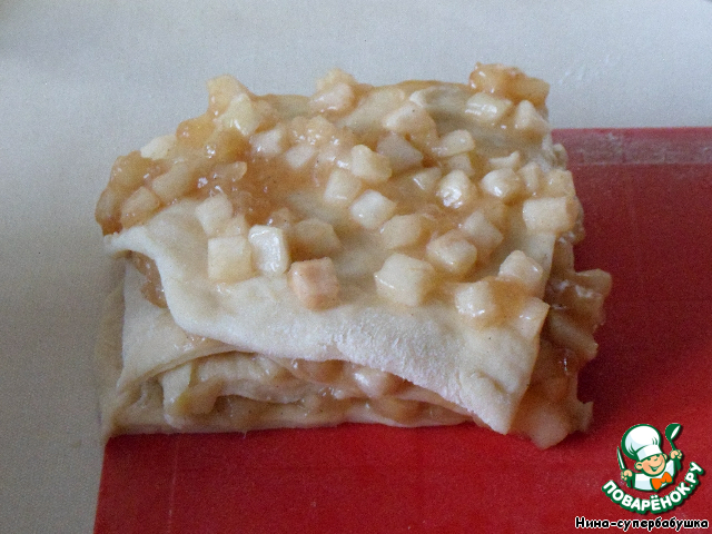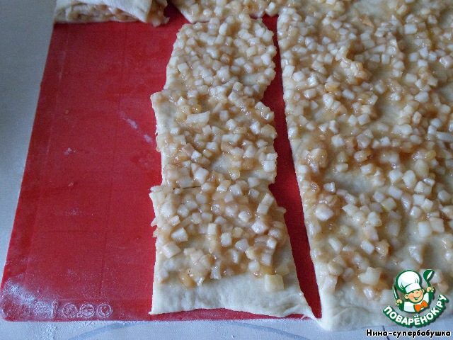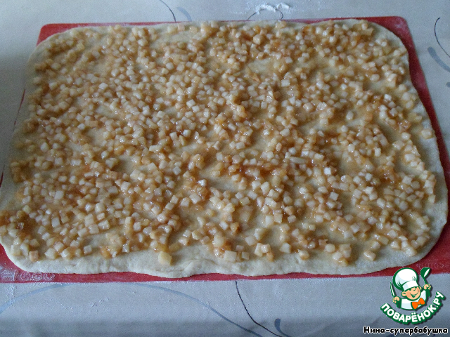 Когда тесто увеличится в объеме не менее, чем в 2 раза, выложить его на стол и раскатать довольно тонко в прямоугольный пласт. Равномерно разложить яблочную начинку.